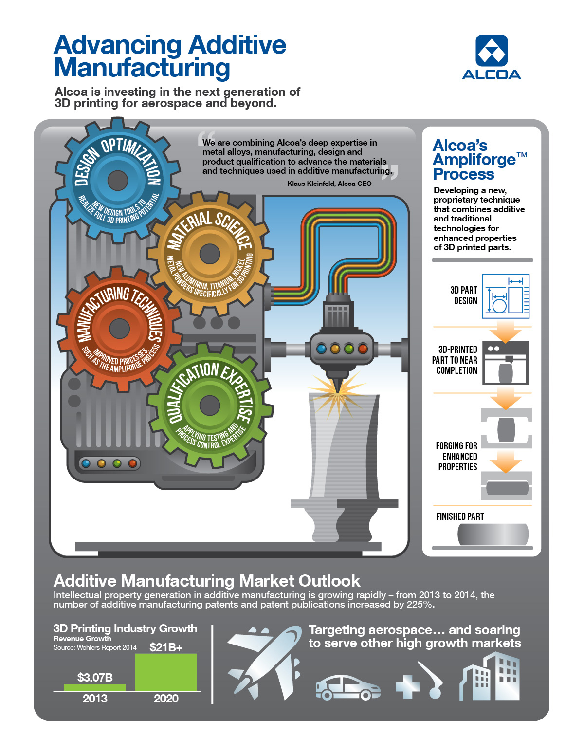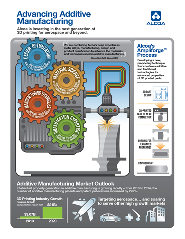 “Alcoa is investing in the next generation of 3D printing for aerospace and beyond,” said Alcoa Chairman and Chief Executive Officer Klaus Kleinfeld. “Combining our expertise in metal alloys, manufacturing, design and product qualification, we will push beyond the limits of today’s additive manufacturing. This investment strengthens our leadership position in meeting fast-growing demand for aerospace components made using additive technologies.”